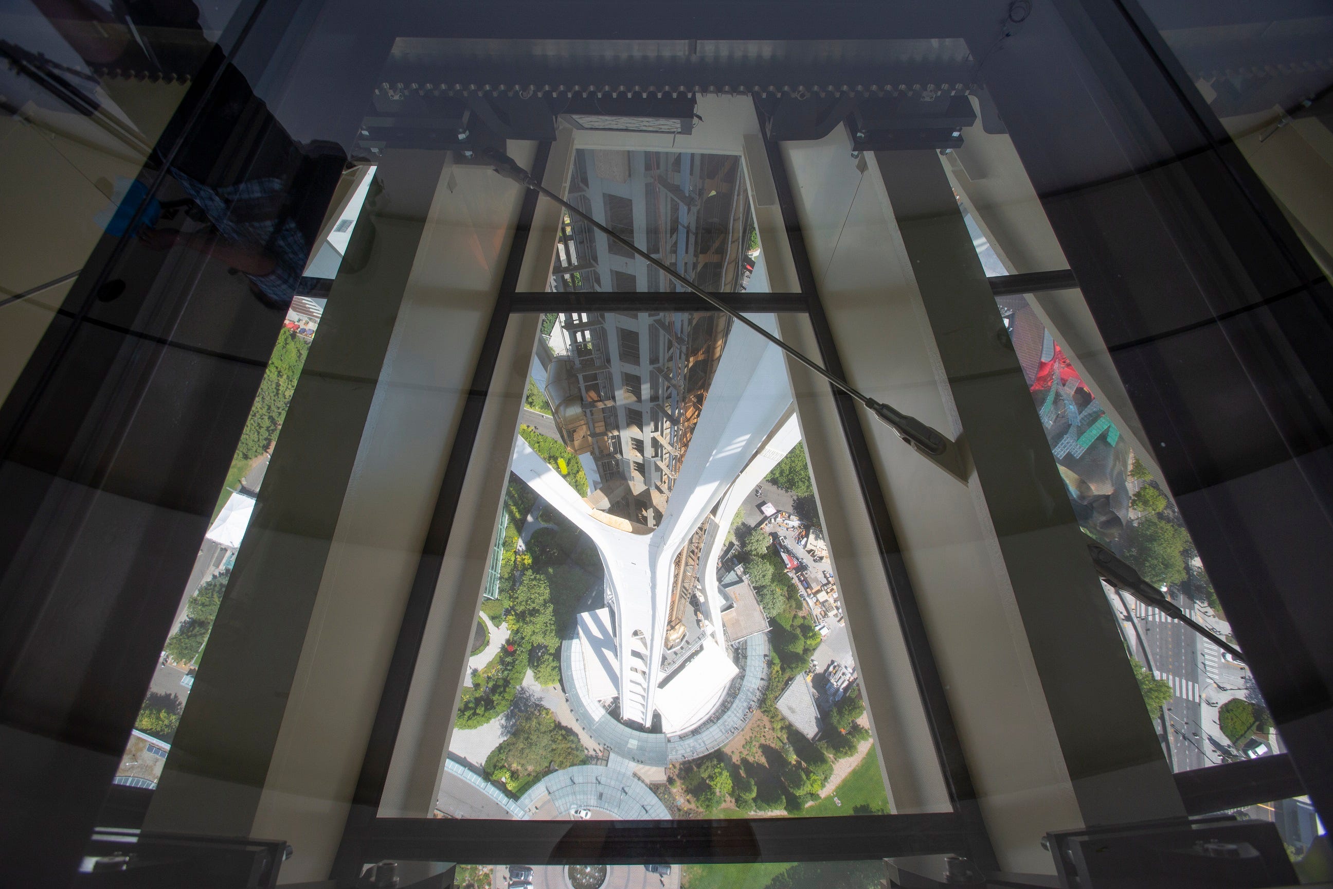 The world’s first and only revolving glass floor is now suspended and spinning – slowly – at the 500-foot level of Seattle’s iconic Space Needle.